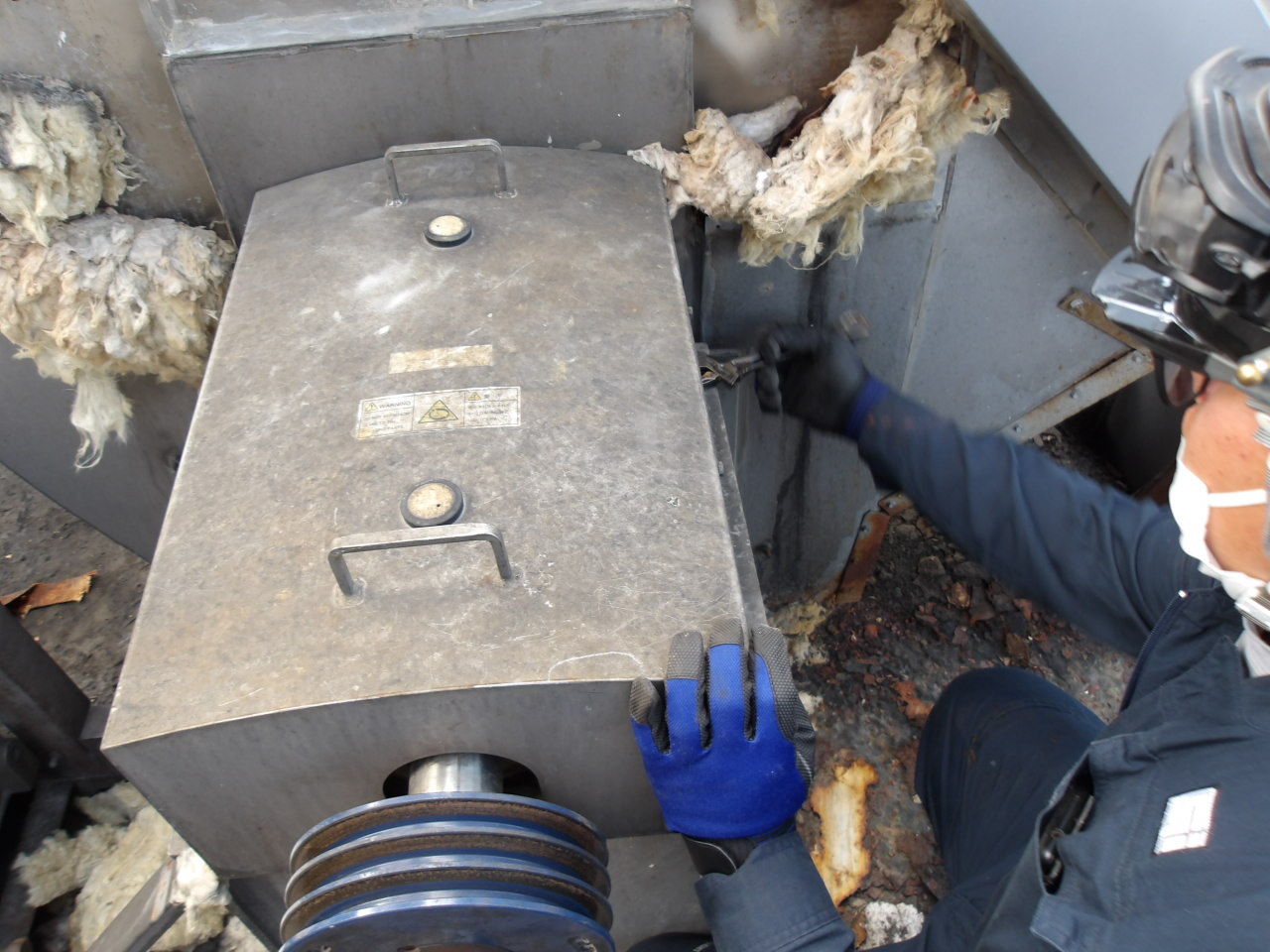 今回の作業では、断熱材を一部取り外し、駆動部やベルト周辺を点検しました。